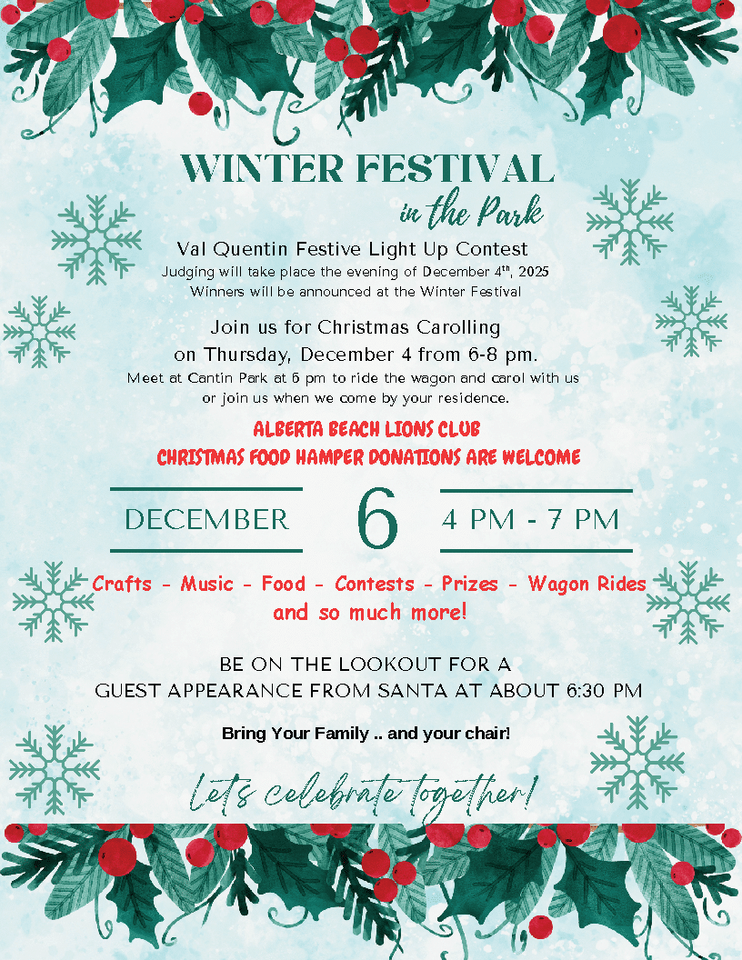 Recent Posts Winter Festival Poster ASVA 2025 Conference SV of Val Quentin 2025 Information Guide Fire Advisory In Effect Summer Village of Val Quentin STAY CONNECTED!! VAL QUENTIN CONNECT Community Picnic in the Park-July 12th Photos 2025 Election Results-Notice of Acclamation LAND USE BYLAW REVIEW Search for: Home » What’s New & Alerts » Winter Festival Poster Winter Festival – Click HERE!